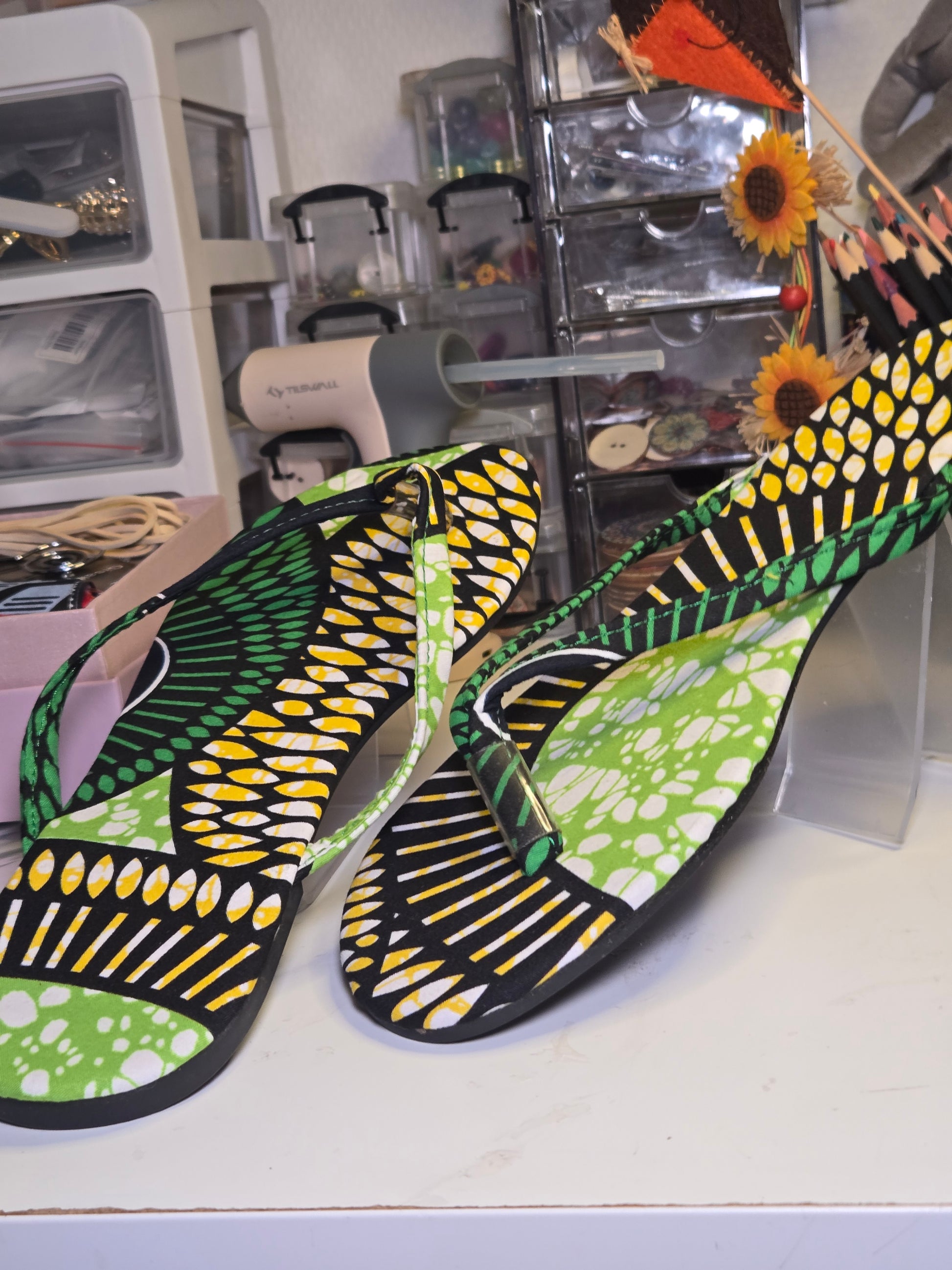 Fraîcheur et nature s'invitent à vos pieds avec cette sandale en pagne vert clair. Sa teinte apaisante et son tissu pagne artisanal en font un accessoire parfait pour les journées en plein air ou les tenues décontractées.